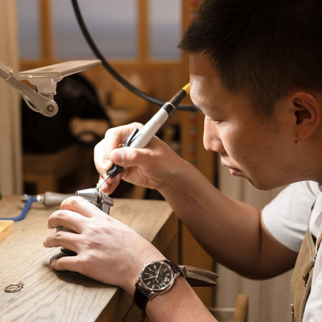 由18K金原料開始,攞起工具,經歴切割、煺火、焊接、鎚打、打磨 ⋯⋯最後將精心挑選嘅鑽石,珍而重之鑲嵌落爪托。對住啱嘅人、啱嘅事,先會有呢份專心一致嘅投入。