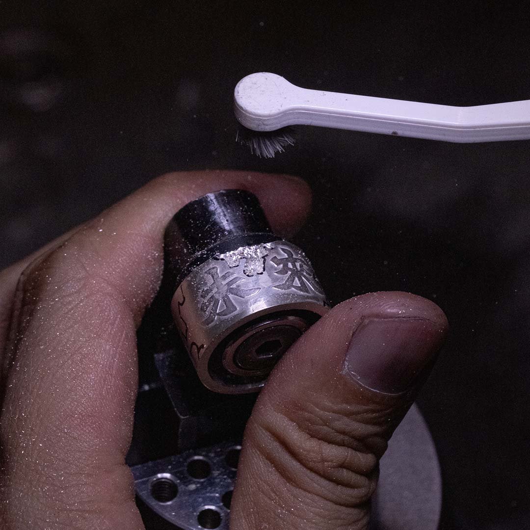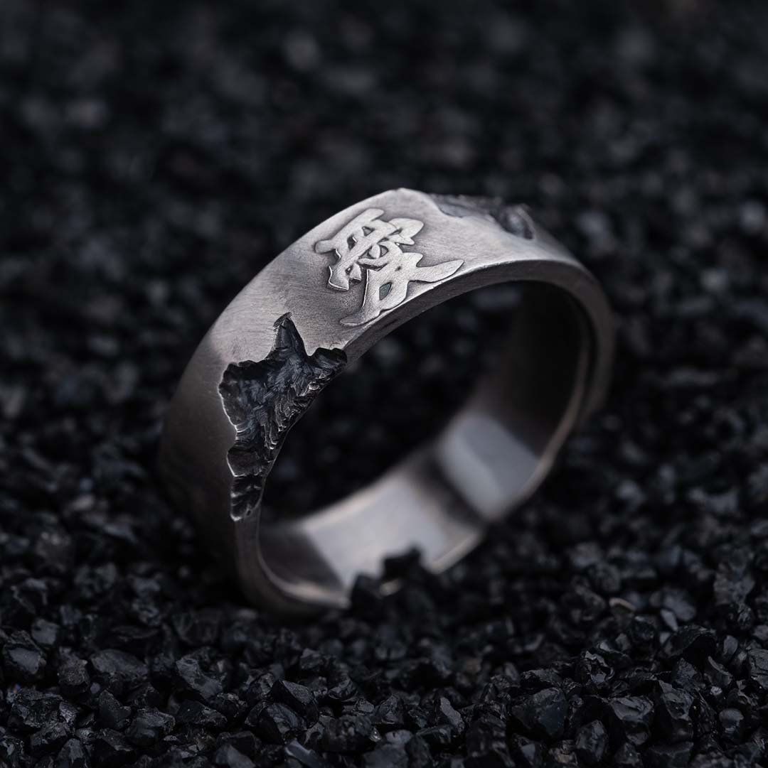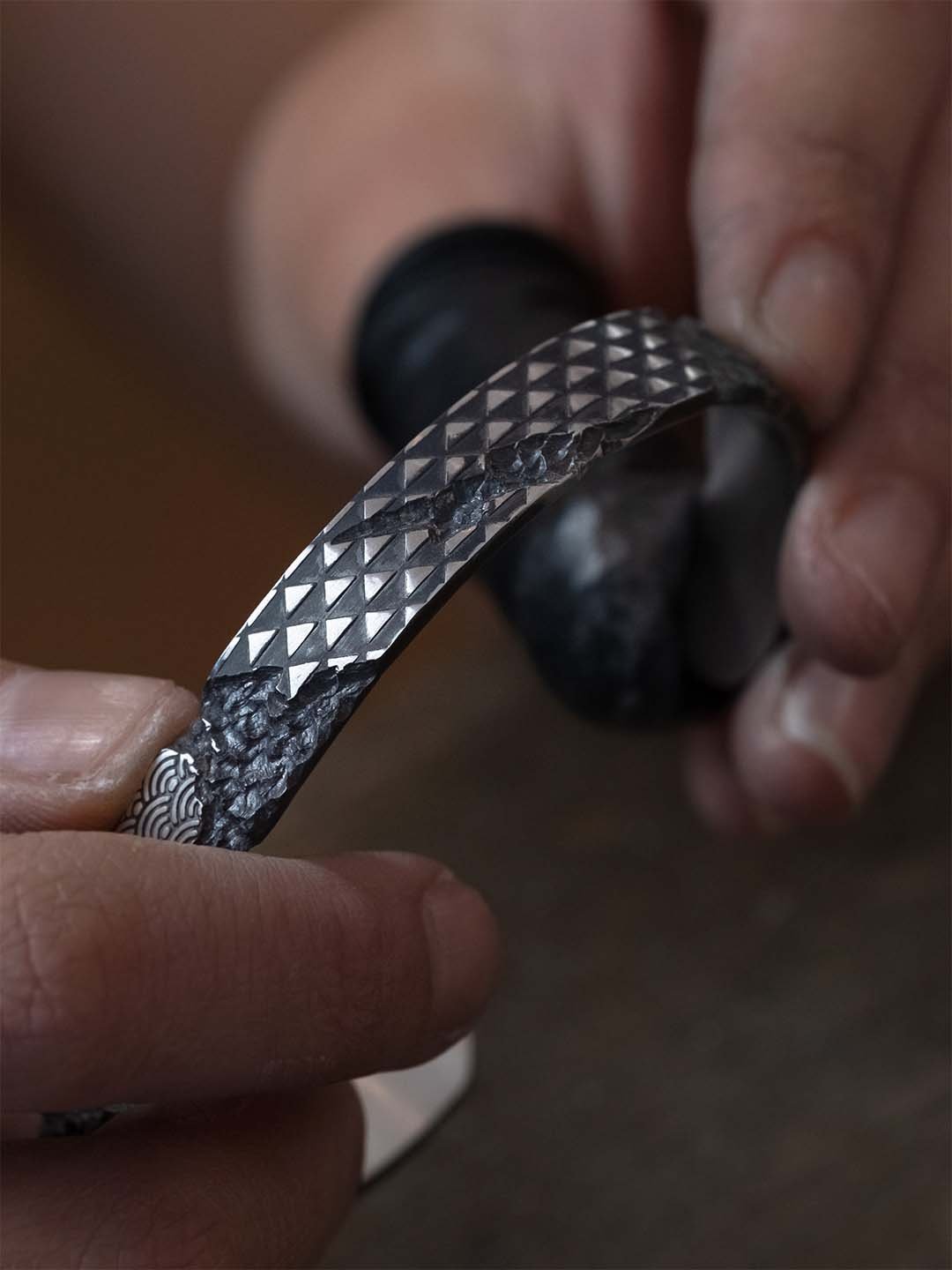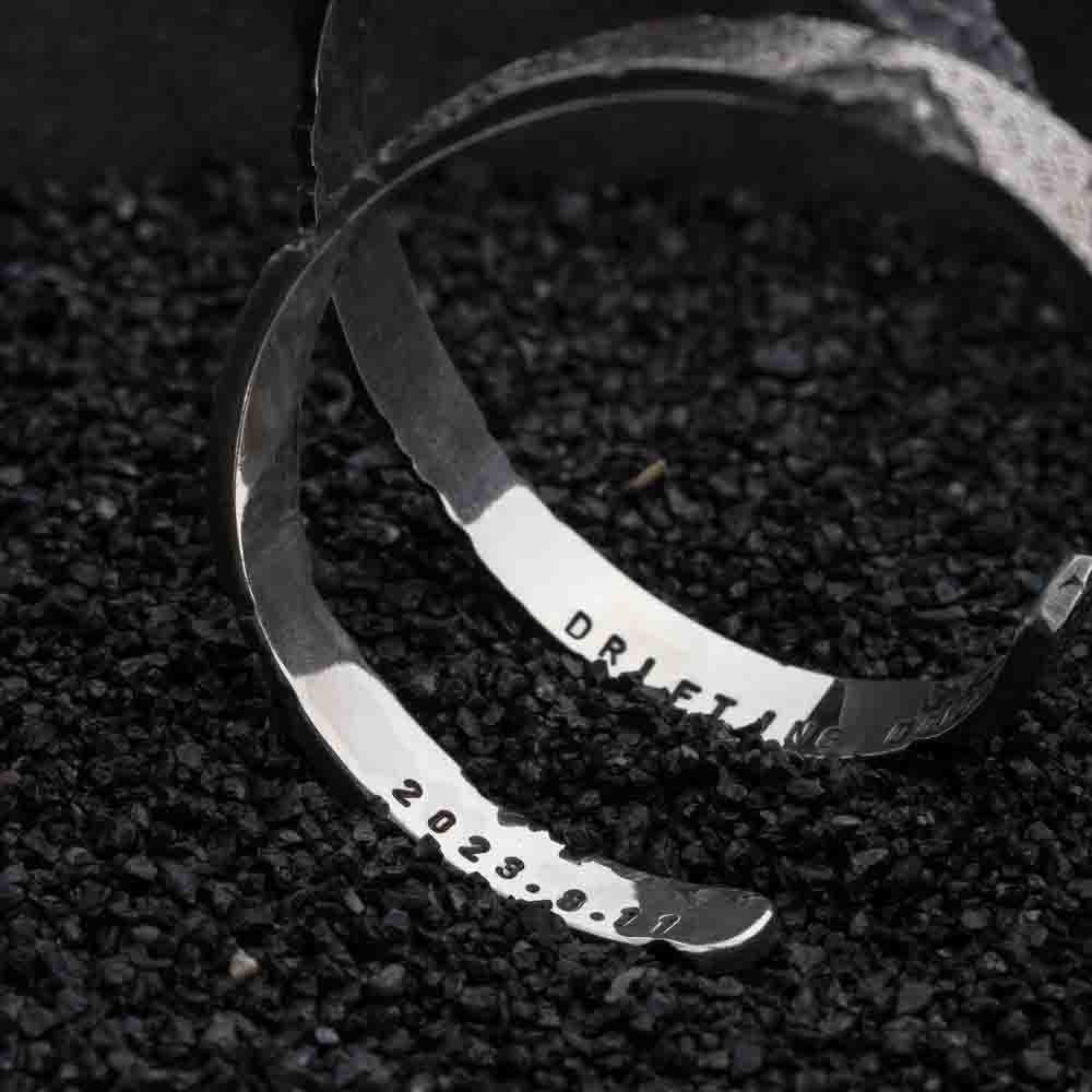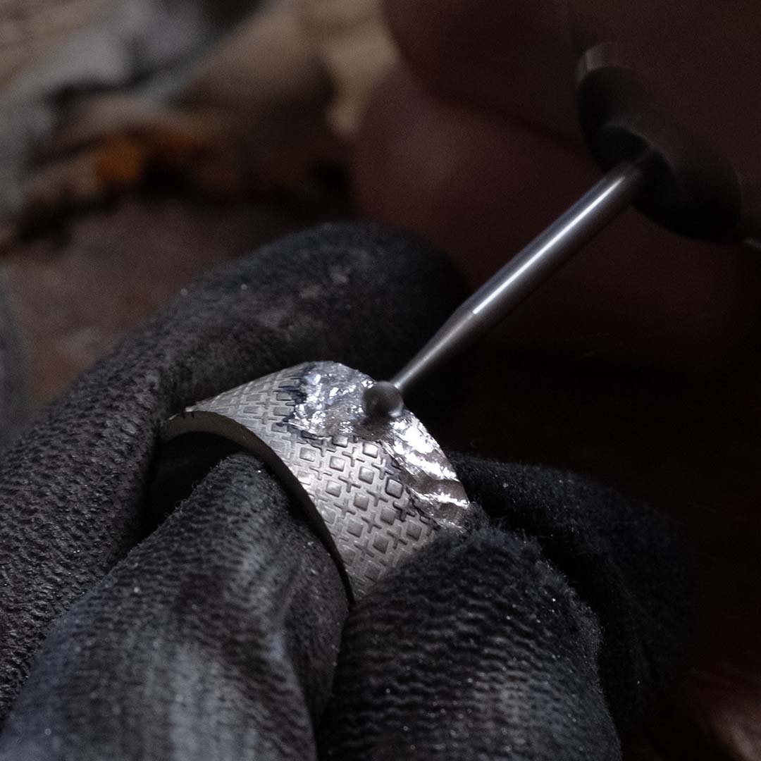 Starting from a strip of gold or silver raw material, cutting, soldering, grinding, hammering texture, lettering, shaping, and lighting by yourself